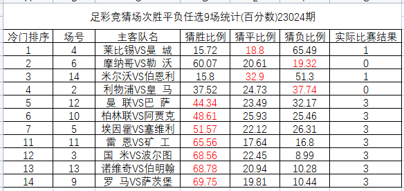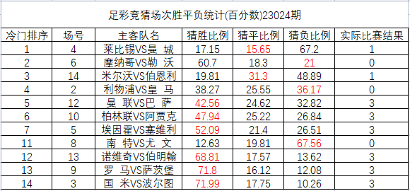 23024期足彩14场冷门排序